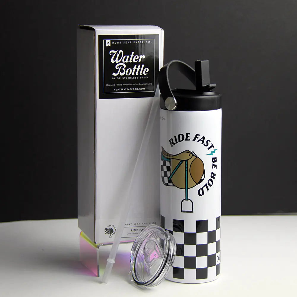 20 oz stainless steel sport water bottle with both tumbler lid + straw and sport cap included! Show the world you totally love horses. Trot to the barn in style with this durable reuseable water bottle. With it's slim design, it will sit perfectly on a jump standard while you ride, ready for a quick hydration stop between courses.