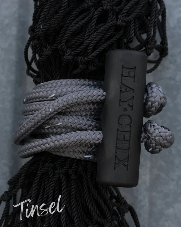 The Hay Chix® Half Bale Net (formerly known as 'Mini Net') attaches easily to a trailer, eye hook, fence, or tree; it's perfect for keeping your feeding program on track while on the go. This net holds about 1/2 of a small square bale (4-6 flakes.)