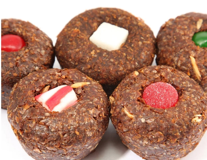 A tasty molasses muffin with peppermints, spice drops, sugar cubes, red and green jelly beans!